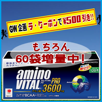 期間限定!ラ・クーポンで500円引![賞味期限]2013年11月以降【期間限定!】味の素 アミノバイタルプロ 120袋+60袋増量《送料無料!》【あす楽対応_東北】【あす楽対応_関東】【あす楽対応_甲 価格: 16,369円 レビュー評価:4.79 レビュー数:216 ★GW企画!ラ・クーポンで500円引き!クーポンの獲得はコチラから★ □■期間限定!60袋増量中!■□ ■標準栄養成分 1袋(4.5g)あたり (メーカー分析値) エネルギー 18Kcal ビタミンB2 0.7mg アミノ酸 3.6g ロイシン 0.54g イソロイシン 0.43g バリン 0.36g グルタミン 0.65g アルギニン 0.61g 他アミノ酸 1.01g たんぱく質 3.6g ビタミンB6 0.9mg 脂質 0.1g ビタミンD 1.8μg 炭水化物 0.5g ビタミンE 1.9mg ナトリウム 0 Supported by 楽天ウェブサービス |